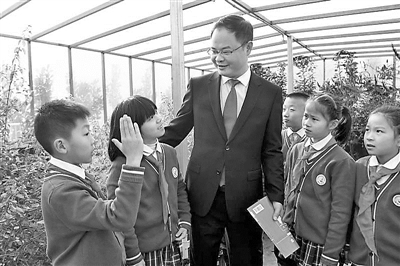 林建锋和孩子们在城东小学未名河畔的蝴蝶园里上科学课。陈炜炜 摄