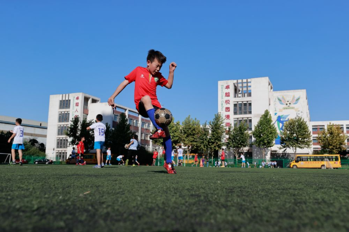 9月30日下午四点的河北省唐山市胥各庄小学操场,学生们的影子被斜阳拉长,几名足球教练各自带着队伍正进行训练。