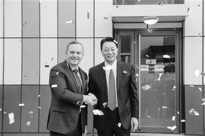 昌平职业学校校长段福生和宝马集团销售副总裁高翔共同为BEST北京培训基地开业揭牌后亲切握手。