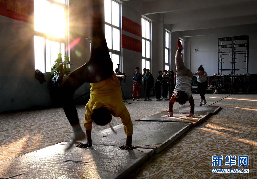 12月5日,新蔡县冰上职业艺术学校的学生在进行倒立训练。 河南省新蔡县冰上职业艺术学校共有在校生69人,其中年龄最小的4岁,最大的不过19岁。除了学习文化课外,他们每天大部分时间都要进行基本功和冰上节目编排训练。 “每当我穿上冰刀鞋登上舞台,就感觉自己像鸟儿一样在飞翔。”17岁的刘艳玲说。通过刻苦训练,学员们表演的一系列集冰上杂技、冰上舞蹈、花样滑冰、魔术于一体的节目多次登上国内外舞台,并获得奖项。 新华社记者 李安 摄