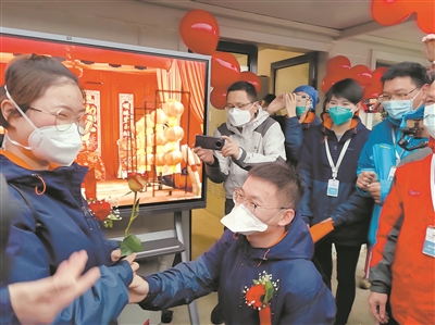 2月28日17时18分,一场特殊的婚礼在武汉雷神山医院办公区举行。新人是上海交通大学医学院附属仁济医院的两位护士于景海(前左二)和周玲亿(左一)。援鄂抗疫让他们错过了原定于上海举办的婚宴,在同事们的安排下,举办了这场简朴的“战地婚礼”。
