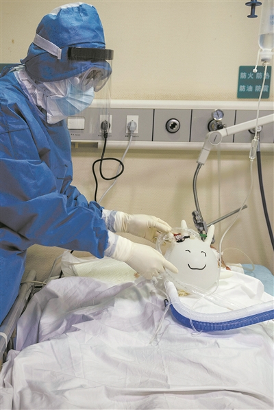 2月26日,华中科技大学同济医学院附属协和医院西院区重症病房里,来自中山大学附属第二医院的护士为了使重症患者呼吸顺畅,将橡胶手套充气后支起氧气管,并在上面画了一个笑脸。潘松刚 摄