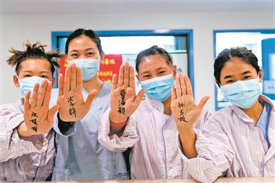 2月16日中午,在华中科技大学同济医学院附属同济医院中法新城院区,几位刚刚从“红区”换班出来的北京协和医院护士,在手掌中写上自己的名字拍张照片,留下在鄂抗疫的印记。潘松刚 摄