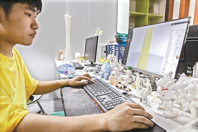 近日,记者走进位于广州市3D打印产业园区的广州建锦道自动控制科技有限公司,大厅陈列着各种打印出来的作品。而3D打印设备操作员郑大腾的办公桌上,堆满了他自己打印出来的雪人、兔子、皮卡丘等小玩意儿。