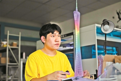在打印室,郑大腾为记者展示了一座约高70厘米的广州塔模型是如何被打印出来的。