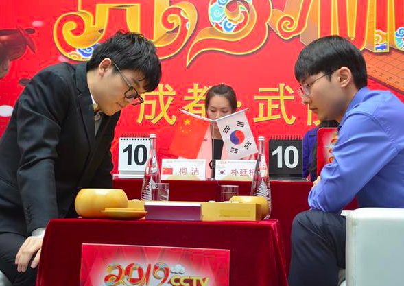 今天下午,柯洁与朴廷桓进行冠军争夺战。在此之前,柯洁和朴廷桓共下了18盘,双方以9比9战平。为此,媒体称此战为柯朴之间的“天王山之战”。经猜先,由朴廷桓执黑先行。世界冠军古力九段、中国围棋队领队华学明七段为央视直播讲棋。
