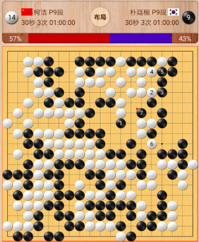 此役,序盘战双方旗鼓相当。在中腹作战,朴廷桓黑119出现失误,被白120强硬贴出,柯洁白棋形势不错。之后,朴廷桓黑棋在中腹出现缓手,至白148,白棋胜势。