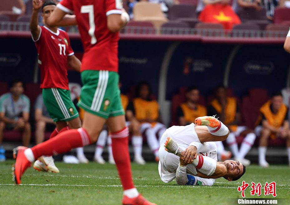 北京时间6月20日晚,2018俄罗斯世界杯B组次轮葡萄牙队与摩洛哥队的较量在莫斯科卢日尼基体育场打响。凭借C罗两场比赛以来的第4个进球,葡萄牙队1-0击败对手,积4分暂时升至小组榜首。而摩洛哥队两战皆负,成为本届世界杯第一支被淘汰的球队。图为C罗受伤倒地。 中新社记者 毛建军 摄