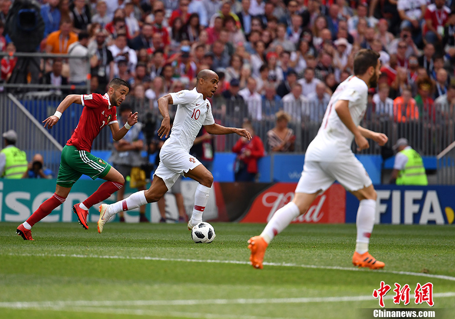 北京时间6月20日晚,2018俄罗斯世界杯B组次轮葡萄牙队与摩洛哥队的较量在莫斯科卢日尼基体育场打响。凭借C罗两场比赛以来的第4个进球,葡萄牙队1-0击败对手,积4分暂时升至小组榜首。而摩洛哥队两战皆负,成为本届世界杯第一支被淘汰的球队。图为马里奥带球。 中新社记者 毛建军 摄