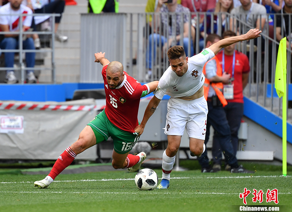 北京时间6月20日晚,2018俄罗斯世界杯B组次轮葡萄牙队与摩洛哥队的较量在莫斯科卢日尼基体育场打响。凭借C罗两场比赛以来的第4个进球,葡萄牙队1-0击败对手,积4分暂时升至小组榜首。而摩洛哥队两战皆负,成为本届世界杯第一支被淘汰的球队。 中新社记者 毛建军 摄