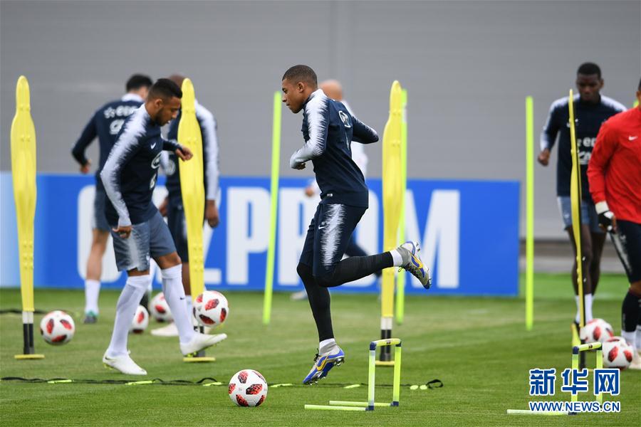 7月4日,法国队球员姆巴佩(中)在训练中。当日,法国队在莫斯科郊区训练,备战俄罗斯世界杯足球赛四分之一决赛。 新华社记者杜宇摄