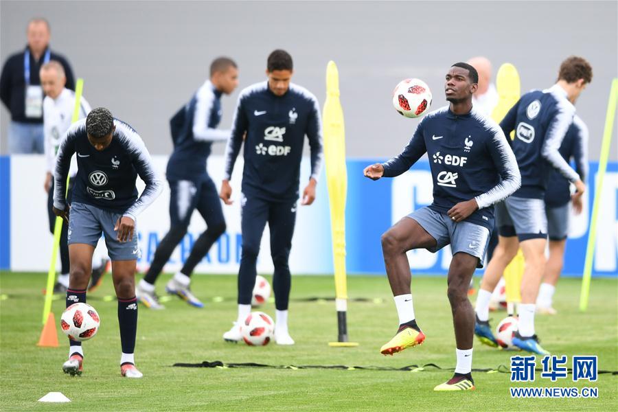 7月4日,法国队球员博格巴(右二)在训练中。当日,法国队在莫斯科郊区训练,备战俄罗斯世界杯足球赛四分之一决赛。 新华社记者杜宇摄