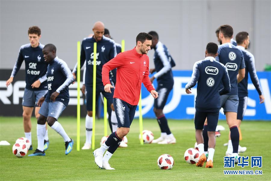 7月4日,法国队门将洛里(前中)在训练中。当日,法国队在莫斯科郊区训练,备战俄罗斯世界杯足球赛四分之一决赛。 新华社记者杜宇摄