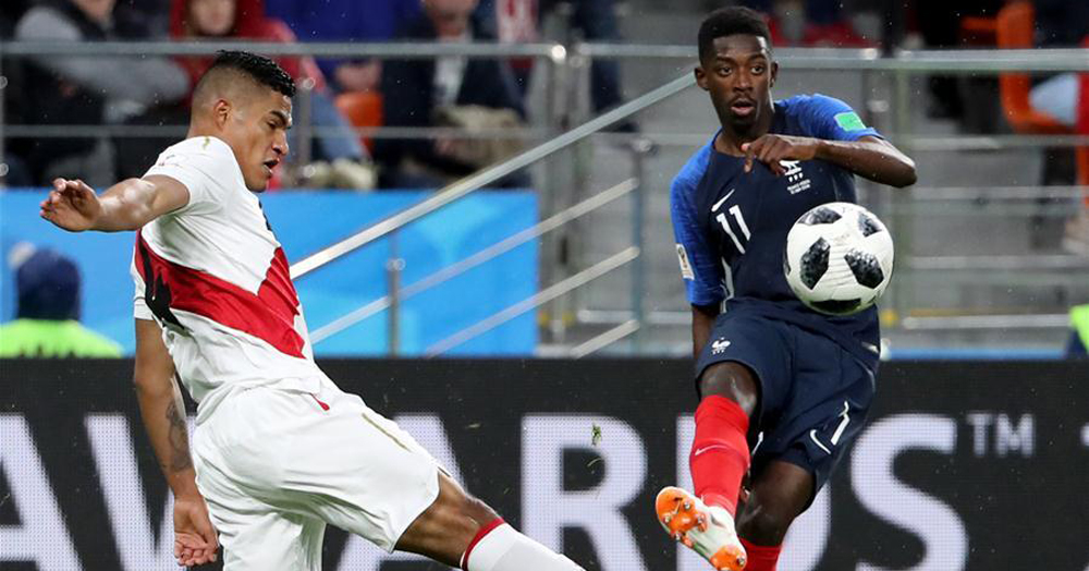 6月21日,秘鲁队球员圣马利亚和法国队球员登贝莱在比赛中拼抢。当日,在叶卡捷琳堡进行的2018俄罗斯世界杯足球赛C组小组赛中,法国队以1比0战胜秘鲁队。