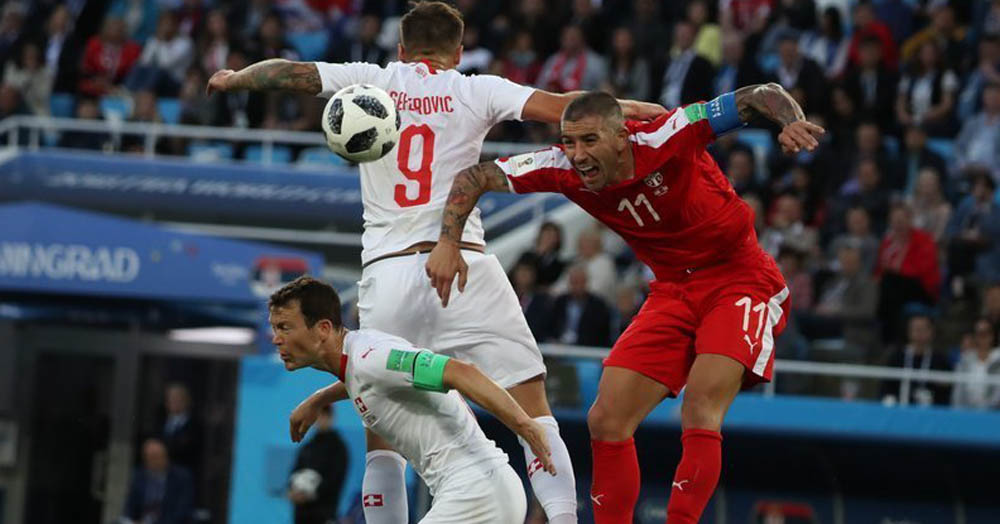 6月22日,瑞士队球员扎卡与塞尔维亚队球员米林科维奇·萨维奇在比赛中争顶头球。当日,在加里宁格勒进行的2018俄罗斯世界杯足球赛E组小组赛中,瑞士队以2比1战胜塞尔维亚队。