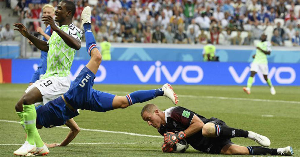 6月22日,冰岛队球员吉斯拉松与尼日利亚队球员恩迪迪在比赛中拼抢。当日,在伏尔加格勒进行的2018俄罗斯世界杯足球赛D组小组赛中,尼日利亚队以2比0战胜冰岛队。