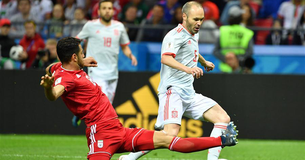 6月20日,西班牙队球员巴斯克斯(上)与伊朗队球员马·侯赛尼拼抢。当日,在喀山进行的2018俄罗斯世界杯足球赛B组小组赛中,西班牙队以1比0战胜伊朗队。