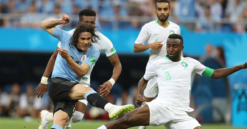 6月20日,乌拉圭队球员卡瓦尼(左.当日,在顿河畔罗斯托夫进行的2018俄罗斯世界杯足球赛A组小组赛中,乌拉圭队以1比0战胜沙特阿拉伯队。