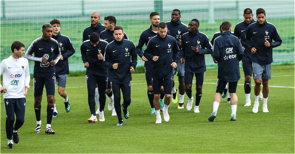 6月11日,法国队主帅德尚(左)在训练中。当日,法国队在莫斯科郊区进行世界杯赛前训练。