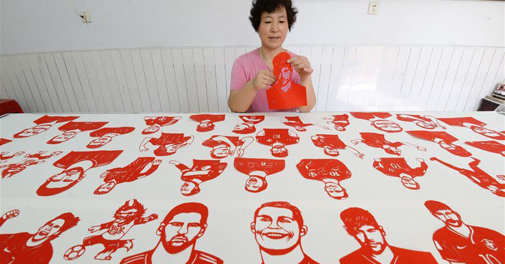 6月12日,河北省邯郸市民间剪纸艺人冯石萍在创作世界杯主题剪纸作品。日前,河北省邯郸市民间剪纸艺人冯石萍利用两周时间,创作出以梅西、C罗、内马尔等球星为原型的剪纸作品,迎接世界杯的到来。