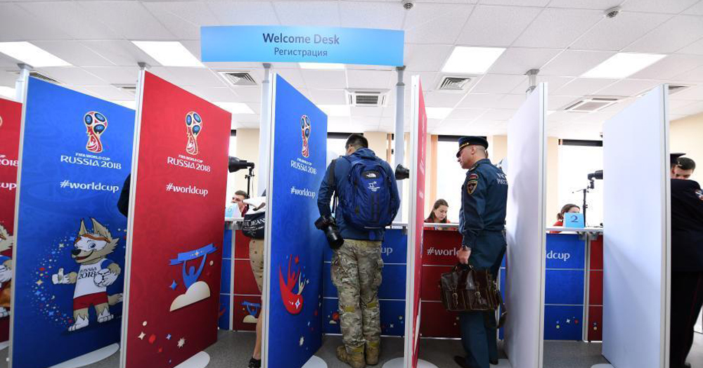 当地时间6月13日,来自世界各地的记者们在2018俄罗斯世界杯足球赛媒体注册中心办理证件。