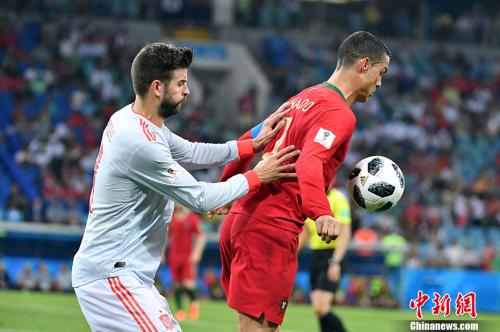 北京时间6月16日凌晨,2018世界杯B组首轮上演伊比利亚半岛德比,葡萄牙在索契菲什特奥林匹克体育场对阵西班牙。在这场进球如梅花间竹般的史诗级对决中,C罗上演帽子戏法,帮助葡萄牙3-3战平西班牙。中新社记者 毛建军 摄