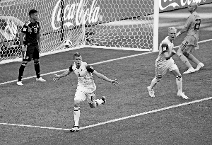 冰岛队球员在比赛中庆祝进球。新华社发