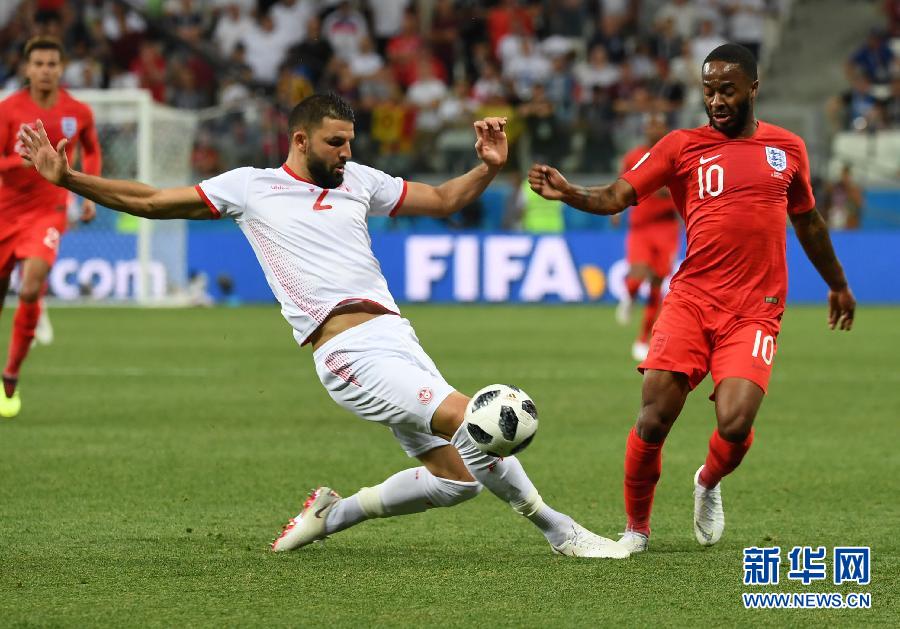 6月18日,英格兰队球员斯特林(右)和突尼斯队球员萨·本·尤塞夫在比赛中拼抢。新华社记者陈诚摄