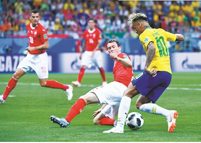上图:6月17日,巴西队球员内马尔(右)与瑞士队球员拼抢。