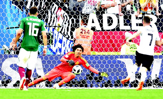北京时间6月18日凌晨,在与德国队的比赛中,墨西哥队门将奥乔亚(中)扑住来球。新华社/欧新