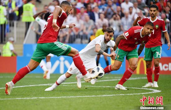 北京时间6月20日晚,2018俄罗斯世界杯B组次轮葡萄牙队与摩洛哥队的较量在莫斯科卢日尼基体育场打响。凭借C罗两场比赛以来的第4个进球,葡萄牙队1-0击败对手,积4分暂时升至小组榜首。而摩洛哥队两战皆负,成为本届世界杯第一支被淘汰的球队。中新社记者 毛建军 摄
