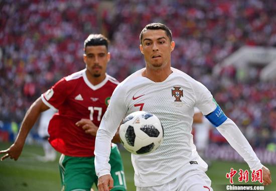 北京时间6月20日晚,2018俄罗斯世界杯B组次轮葡萄牙队与摩洛哥队的较量在莫斯科卢日尼基体育场打响。凭借C罗两场比赛以来的第4个进球,葡萄牙队1-0击败对手,积4分暂时升至小组榜首。而摩洛哥队两战皆负,成为本届世界杯第一支被淘汰的球队。中新社记者 毛建军 摄