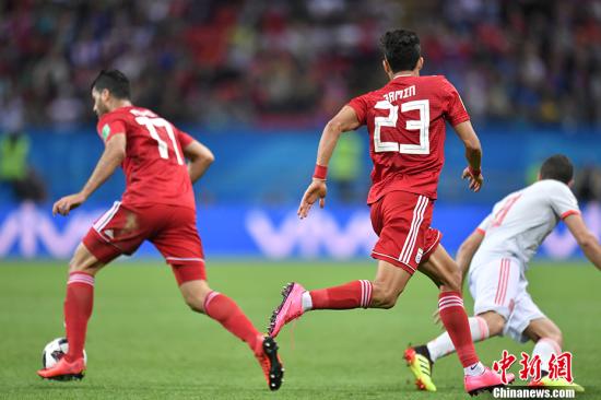 北京时间6月21日凌晨,2018俄罗斯世界杯B组次轮伊朗队与西班牙队的较量在喀山打响。西班牙队凭借迭戈科斯塔一记幸运的进球,一球小胜伊朗队,与葡萄牙同积4分并列小组第一。中新社记者 田博川 摄