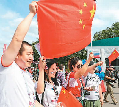 6月14日,2018年俄罗斯世界杯足球赛在莫斯科卢日尼基球场拉开战幕,图为来自中国的球迷在球场外合影。新华社记者 杨 磊摄