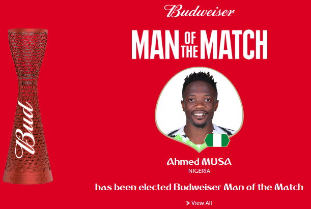 赛后,在比赛中独中两元的穆萨被评为本场比赛的最佳球员。上半时,尼日利亚队手握61%的控球率却无一脚射门,反而是冰岛队发动了几次有效的进攻。下半场开场仅4分钟,穆萨接队友右路传中破门得分。此后,一球领先的尼日利亚被彻底激活,在对方禁区内频频制造威胁。第75分钟,穆萨再次杀入禁区,晃开对方门将射空门得分,为尼日利亚锁定比赛胜局。此役过后,上一场失利的尼日利亚队积3分,仍然保留出线希望,而打入两球的穆萨无疑是本场尼日利亚队取胜的最大功臣。