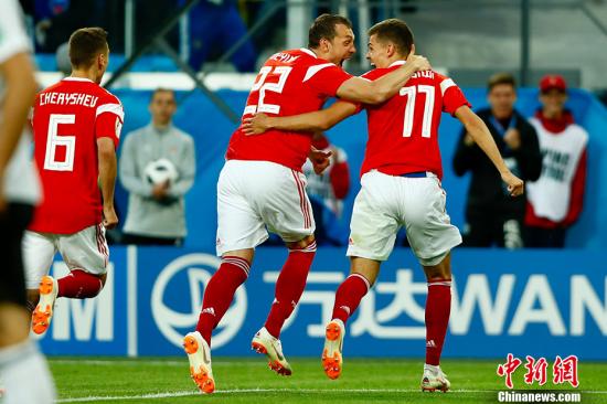 俄罗斯队员庆祝进球。中新社记者 富田 摄