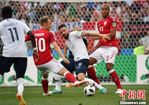 2018俄罗斯世界杯C组丹麦与法国的比赛在莫斯科卢日尼基体育场打响,最终两队0:0握手言和。图为双方争抢球权。中新社记者 毛建军 摄