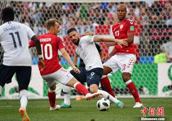2018俄罗斯世界杯C组丹麦与法国的比赛在莫斯科卢日尼基体育场打响,最终两队0:0握手言和。图为双方争抢球权。中新社记者 毛建军 摄