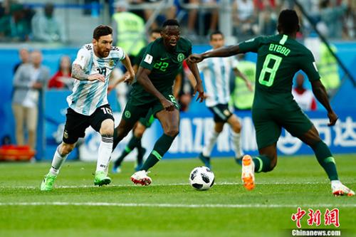 2018俄罗斯世界杯D组阿根廷2:1战胜尼日利亚。图为梅西带球突破。