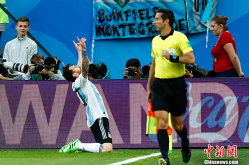 2018俄罗斯世界杯D组阿根廷2:1战胜尼日利亚。图为梅西进球后指天庆祝。中新社记者 富田 摄