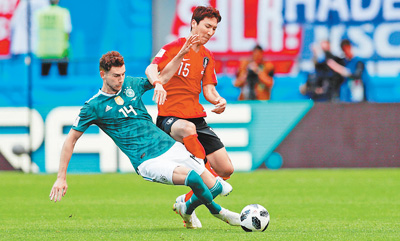 当地时间6月27日,德国队球员格雷茨卡(左)与韩国队球员在比赛中拼抢。当日,在喀山进行的俄罗斯世界杯F组小组赛第三轮比赛中,德国队以0∶2负于韩国队。在当日进行的另一场F组比赛中,瑞典队以3∶0战胜墨西哥队。小组赛过后,瑞典队与墨西哥队同积6分,分列小组前两名,晋级1/8决赛。