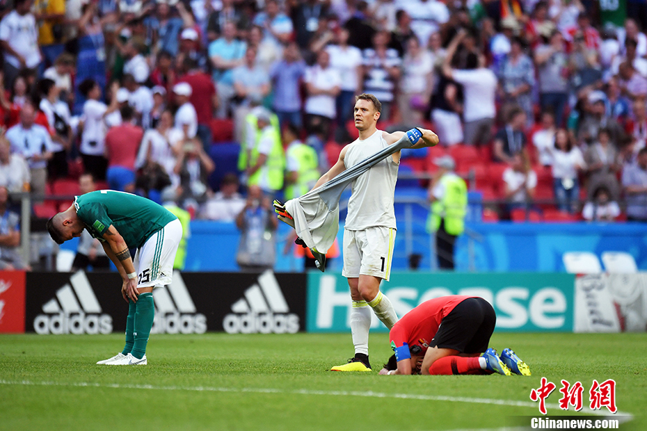 北京时间6月27日晚,2018俄罗斯世界杯F组韩国队与卫冕冠军德国队的比赛在喀山竞技场打响。最终,韩国2:0完胜德国队,在另外一边的比赛中,瑞典3:0完胜墨西哥。瑞典与墨西哥队分列小组第一、第二,携手晋级16强。卫冕冠军德国队遗憾出局。 中新社记者 田博川 摄