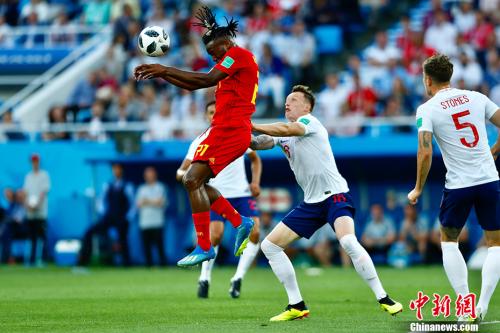 俄罗斯世界杯G组,比利时1:0战胜英格兰。图为双方争抢足球。中新社记者 富田 摄