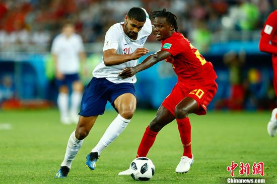 俄罗斯世界杯G组,比利时1:0战胜英格兰。图为双方争抢足球。中新社记者 富田 摄