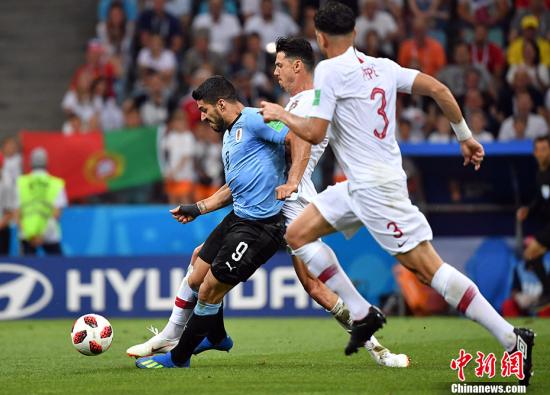2018俄罗斯世界杯乌拉圭2:1战胜葡萄牙。图为苏亚雷斯带球突破。中新社记者 毛建军 摄