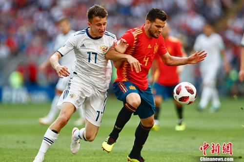 比赛一开场,以传控体系见长的西班牙队逐渐掌握场上主动,控球率一度高达72%。东道主俄罗斯队积极防守,借机寻找反击机会。比赛进行到第10分钟,西班牙队中场伊斯科送出长传,纳乔前插停球后被俄罗斯后卫日尔科夫踢倒,西班牙队前场获得位置不错的定位球。