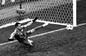 淘汰赛踢了3场,西班牙队成为第四个离开的豪门球队。面对东道主,他们全场79%的控球率、23脚射门及8次射正,却没能在120分钟内解决战斗。除了传控战术被多方诟病,俄罗斯队顽强的拼抢和防守同样不容忽视,其中首推的便是120分钟内做出9次扑救的门神队长阿金费耶夫。他在第85分钟和第109分钟的神级扑救,力阻对手改写比赛结果,这只是他表演的开始。点球大战2度扑出西班牙队的射门,才是将卢日尼基体育场气氛推向顶点的时刻,用腿挡出阿斯帕斯的点球(如图),则堪称最高光的表现。