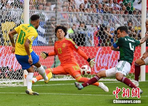 中新网7月3日电 北京时间昨晚,俄罗斯世界杯一场1/8决赛打响,巴西2:0战胜墨西哥晋级八强。在本场比赛中,尽管墨西哥门将奥乔亚高接低挡,但仍然对“桑巴军团”的攻击群们无可奈何,目睹球队两球落败被淘汰出局。