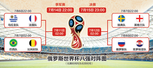 李中文:我希望来自南美的巴西队、乌拉圭队都能进四强。另两支进入四强的球队我看好克罗地亚队与英格兰队。当然,乌拉圭队与法国队的比赛,最终很有可能胜出的是法国队。算来算去,由于上下半区实力不均衡,决赛在南美球队与欧洲球队间进行最理想,现在这支巴西队实力状态都还不错,他们捧杯有可能,也有合理性。但看看八强对阵形势,应该说,欧洲球队捧杯的概率更大些。