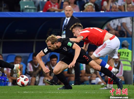 北京时间7月8日凌晨2:00,俄罗斯世界杯最后一场1/4决赛在索契上演,俄罗斯和克罗地亚120分钟内战成2:2平,点球大战中,克罗地亚队5罚4中,俄罗斯队5罚3中,最终克罗地亚总比分6:5战胜俄罗斯,杀进四强,半决赛中他们将对阵英格兰队。中新社记者 毛建军 摄